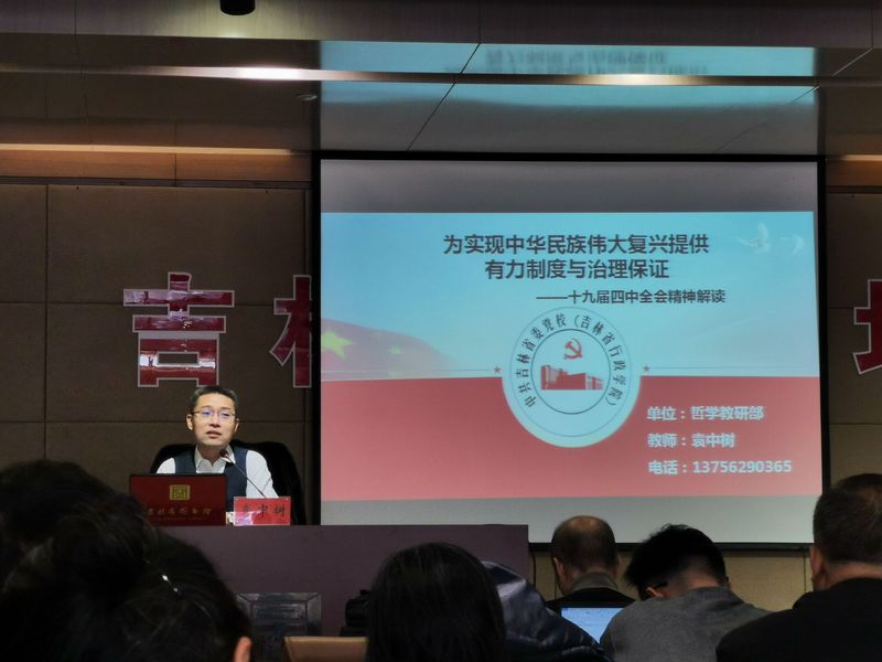 本网讯(通讯员刘心悦)12月1日下午,伟德victor1946MMDS学会在吉林省图书馆参加“为实现中华民族伟大复兴提供有力制度与治理保证——党的十九届四中全会精神解读讲座”活动。入党申请人培训班部分学员参加了此次活动。此次活动由中共吉林省党委校哲学教研部副教授,哲学博士袁中树主讲。