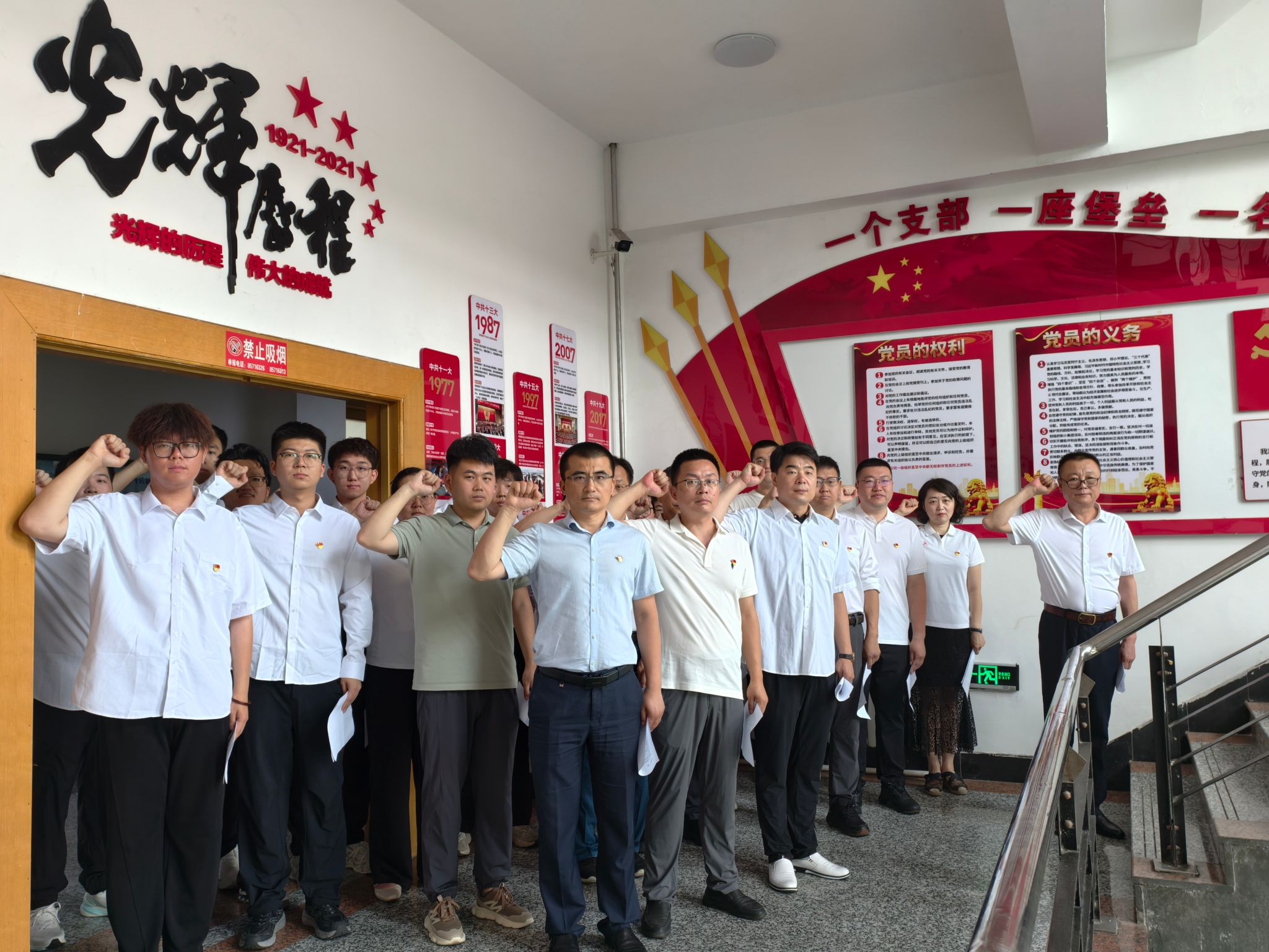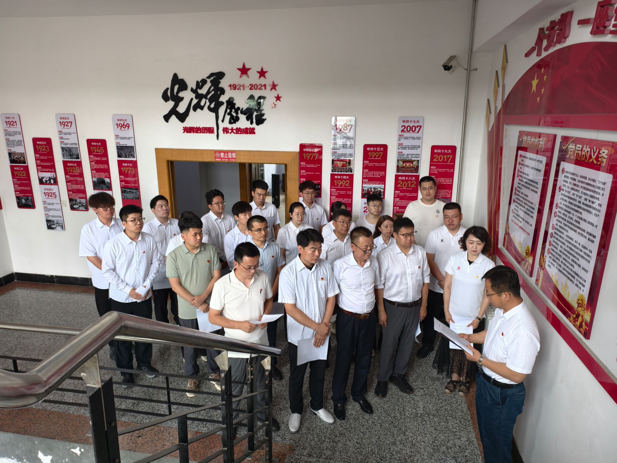 公司党委在党建文化长廊组织了“初心如磐·仪式教育”活动。活动在党委书记张利军的领誓下拉开帷幕,全体党员面向党旗庄严宣誓,重温入党誓词,坚定理想信念,铿锵有力的誓言在长廊内久久回荡。