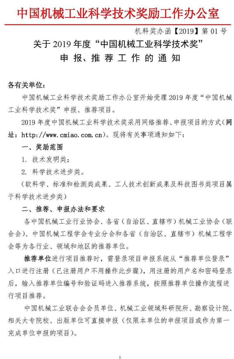 关于2019年度“中国机械工业科学技术奖”申报、推荐工作的通知(转发)
