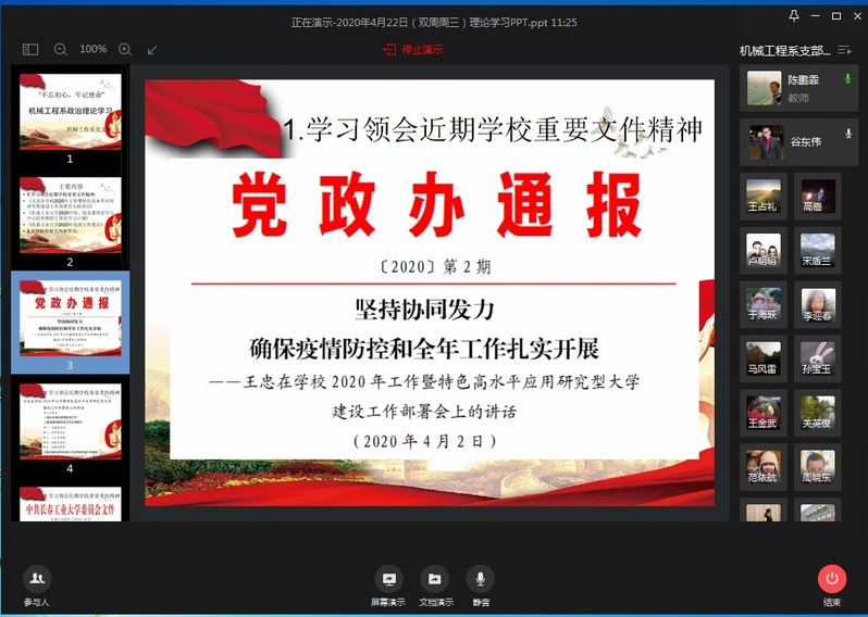 本网讯(通讯员 王潇猇)4月22日,伟德victor1946各支部组织网上“双周三”政治理论学习,全体教师、员工在各自党支部进行了学习。