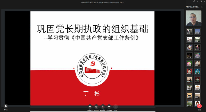 本网讯(通讯员 王潇猇)为了进一步加强基层组织建设,提升基层党组织建设质量,充分发挥党支部战斗堡垒作用和党员先锋模范作用,6月17日上午,公司邀请了中共吉林省委党公司党建教研部主任丁彬教授为全院教师作了题为《巩固党长期执政的组织基础》专题报告,报告会采用网络形式,公司班子成员、党支部书记、全体政工干部在1387会议室主会场,其他教师通过企业微信在线上聆听了报告。