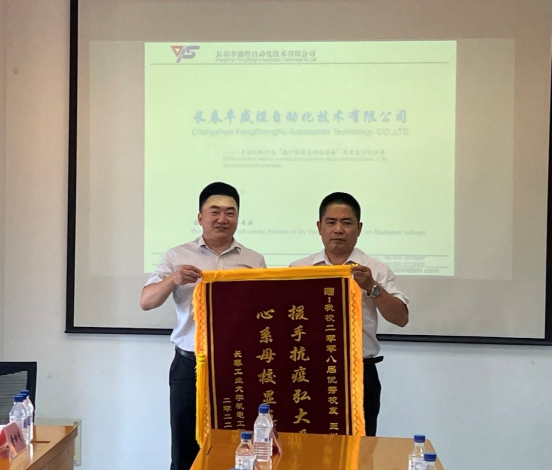 公司2004级员工、公司董事长王兴中对母校老师的到访表示热烈欢迎,并对公司发展情况、产品研发能力、发展战略及人才需求进行了介绍。李奇涵就公司整体情况、员工培养、专业建设、实习实训基地建设及产学研合作情况等进行了介绍,并对疫情防控期间王兴中先生对母校的物资捐赠表示衷心感谢,于保军向王兴中先生颁发抗疫捐赠证书,黄向东代表公司向长春丰盛煜公司赠送锦旗。