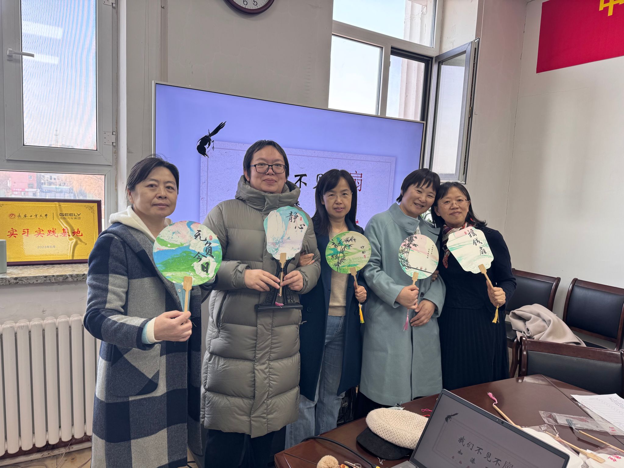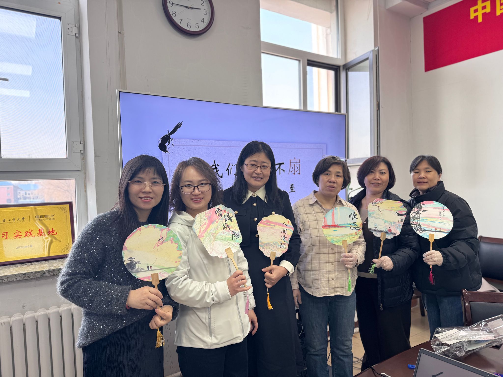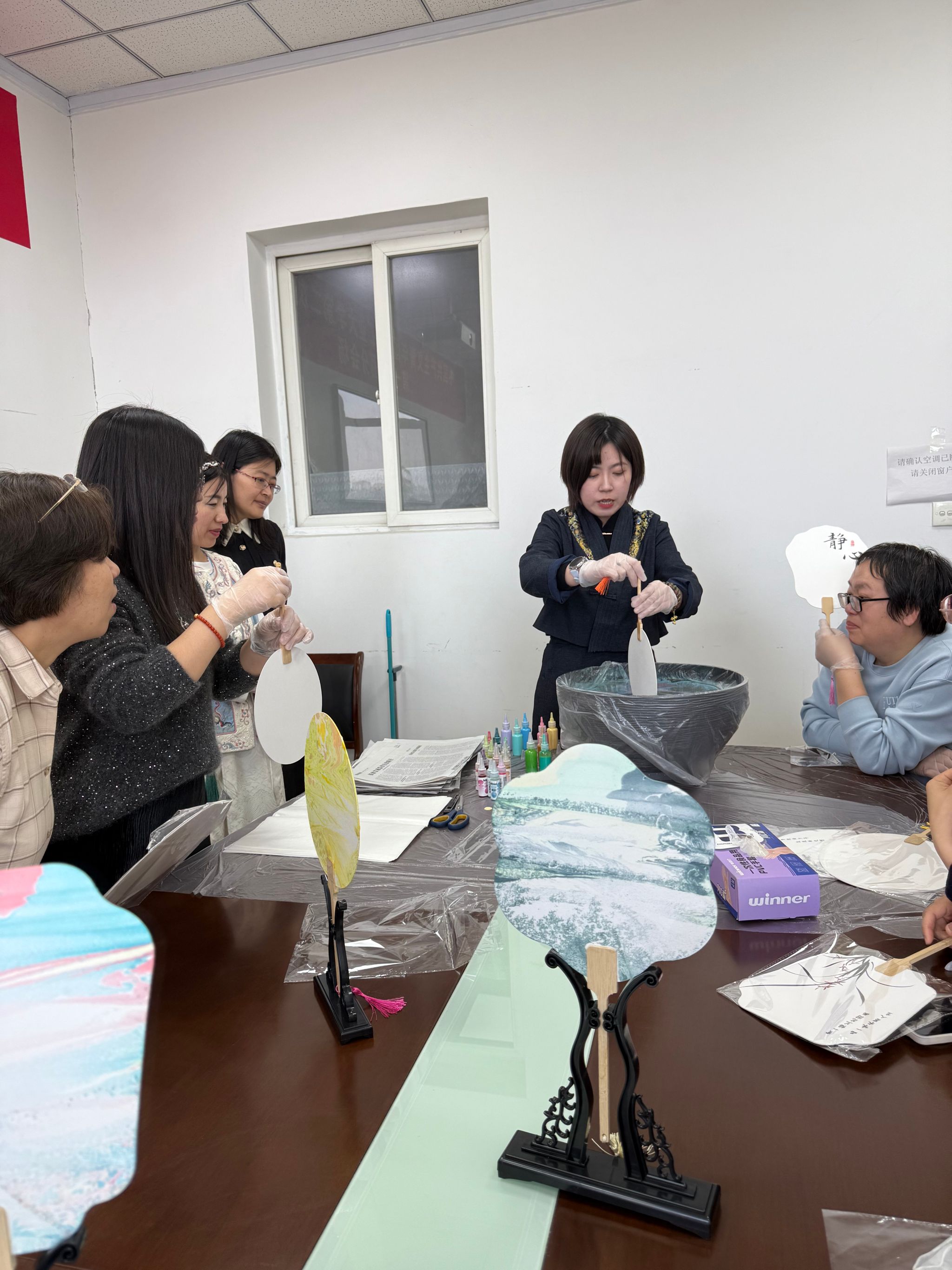 进入实际操作环节,老师们纷纷变身“艺术家”,亲自上手制作漆扇。大家纷纷挑选心仪的扇面图案和颜色,开始精心创作。现场气氛热烈,欢声笑语不断。老师们互相交流心得,分享经验,在互帮互助中共同进步。经过一个多小时的努力,一把把色彩缤纷、各具特色的漆扇作品逐一呈现。大家欣赏着自己的劳动成果,脸上洋溢着喜悦和自豪。活动最后,老师们手持亲手制作的漆扇合影留念,记录下这美好而难忘的时刻。