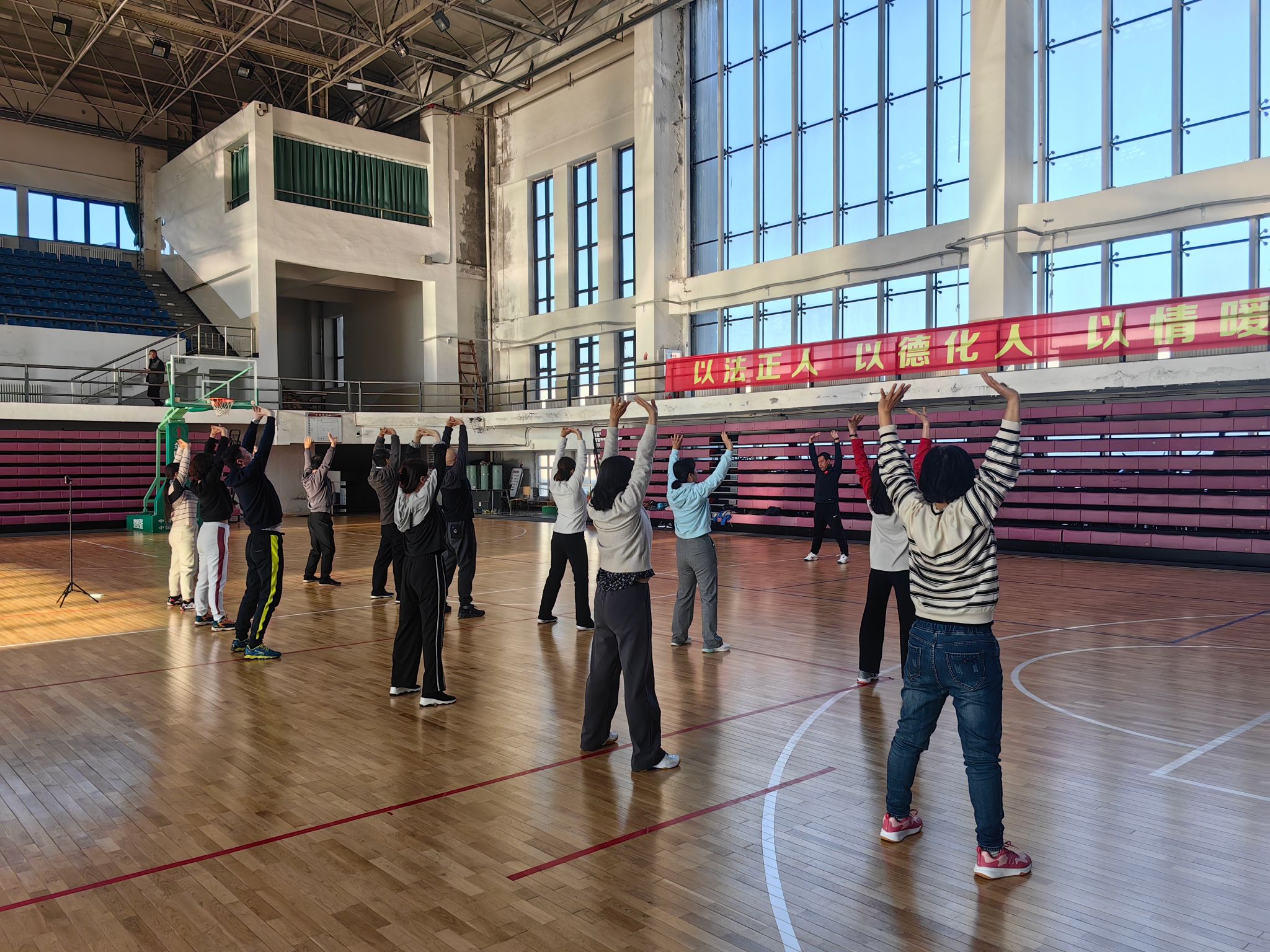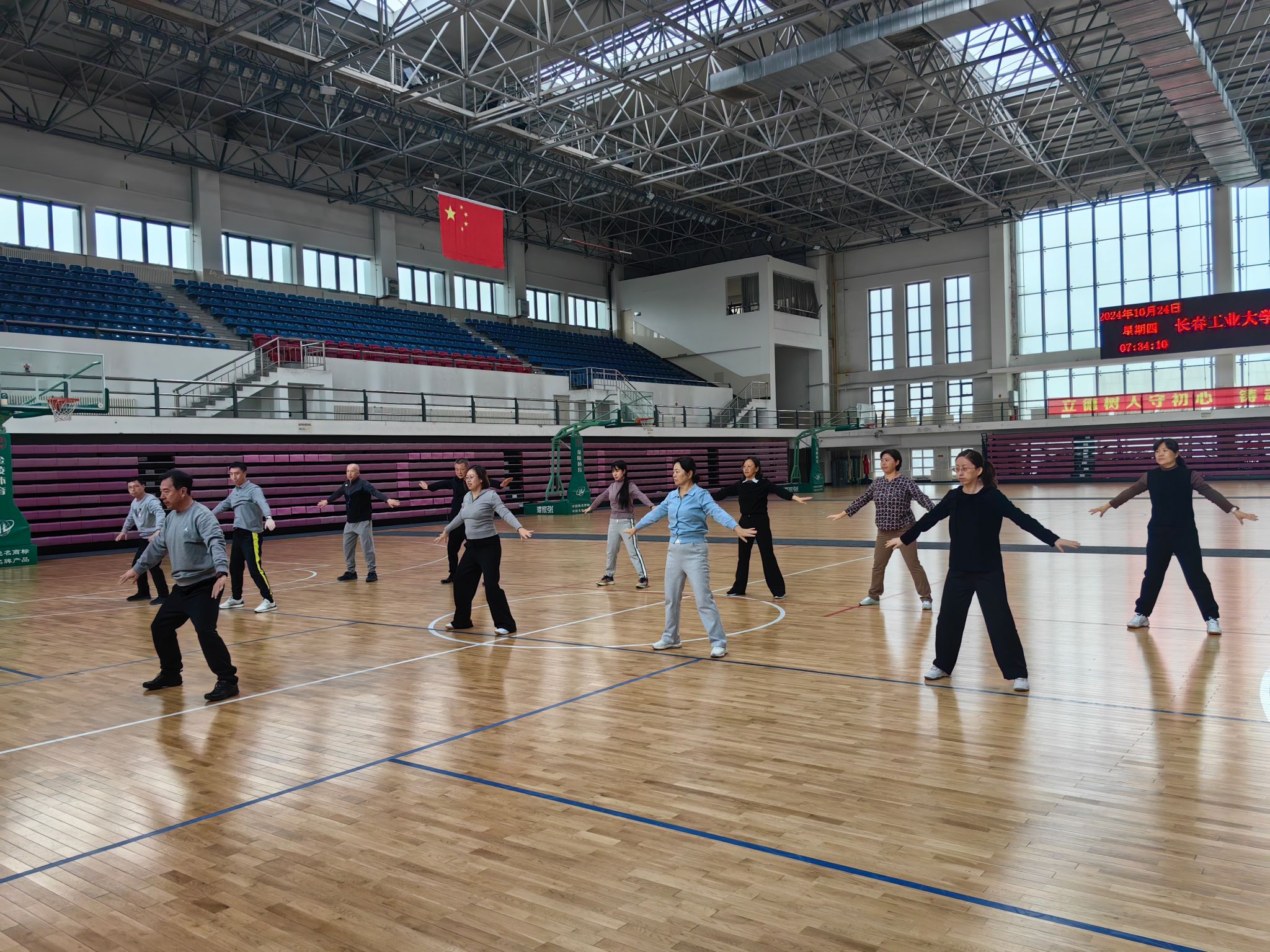 八段锦作为国家非物质文化遗产,具有调理脏腑、疏通经络、调和气血等多重功效。每周两次的晨练活动在南湖校区体育馆3楼准时开展。在奚主任的专业指导下,老师们系统学习了这套传承千年的养生功法。通过“双手托天理三焦”等八个经典动作,配合深长呼吸,能够有效缓解肩颈腰背疲劳,改善心肺功能,增强免疫力,不仅锻炼身体,还能放松心情,为一天的工作注入活力。同时,活动还融入其他健身养生操,为教职工提供多元化的健康选择。