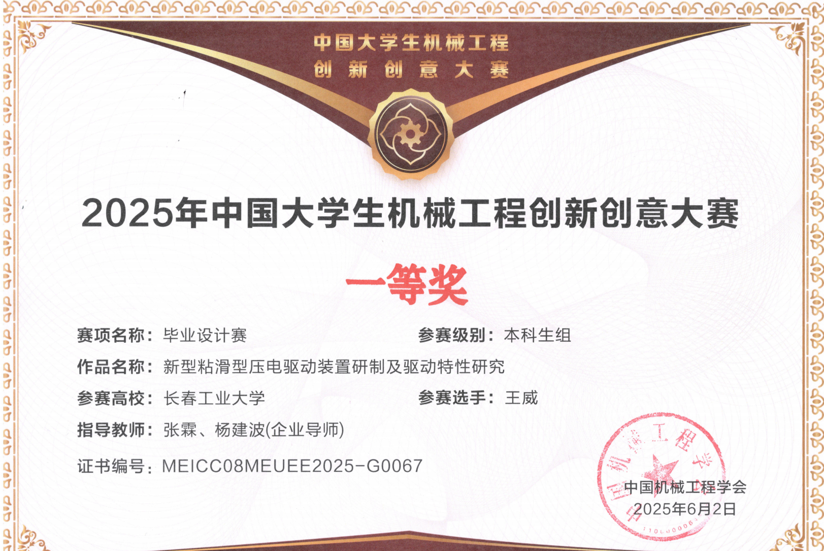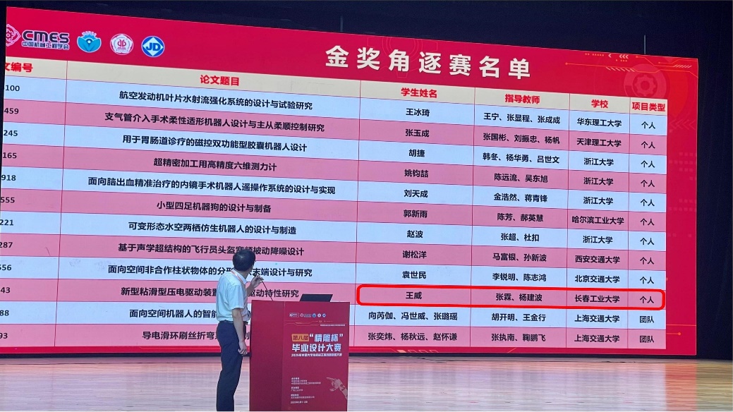本网讯(通讯员 张霖)2025年6月2日,由中国机械工程学会、中国机械行业卓越工程师教育联盟主办,广东工业大学承办的2025年中国老员工机械工程创新创意大赛第八届“精雕杯”毕业设计大赛全国总决赛顺利举行。伟德victor1946王威同学的作品《新型粘滑型压电驱动装置研制及驱动特性研究》(指导教师:张霖、杨建波)荣获个人赛银奖(全国一等奖)。