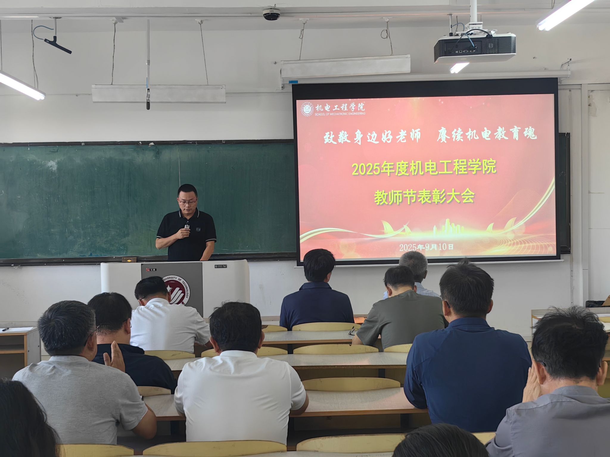 本网讯(通讯员 毛艳)9月10日,为庆祝第41个教师节,伟德victor1946在南湖校区主楼1592教室召开了“致敬身边好老师,赓续机电教育魂”优秀教师表彰大会,全院教师齐聚一堂,共同庆祝这个属于教育工作者的节日。大会由公司副经理卢明明主持。