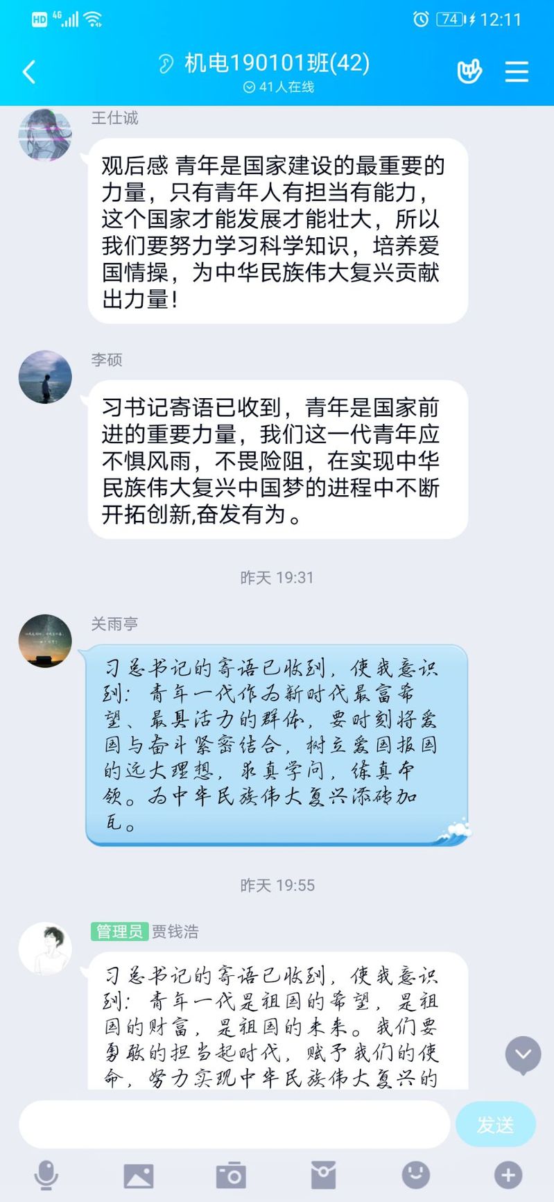 全院团支部将学习习近平总书记对新时代青年寄语精神纳入“青年大学习”行动全年计划,根据疫情防控形势,开展线上集体学习、分享交流等活动,各位团员积极发表自己的感悟:习近平总书记的寄语饱含殷切期望,给新时代的青年带来了巨大的信心和希望,给青年人指明方向,为青年人鼓足干劲。作为中国新青年的我们,在仰望星辰的同时亦脚踏实地。用实际行动去证明,中国青年是好样的。在时代的洪流中,不忘初心,牢记使命,响应时代召唤,为民族团结,国家安定,人民幸福的中华民族伟大复兴的共同理想作出不懈努力。