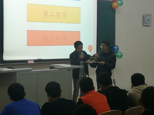 本次大赛旨在加强同学的动手能力和专业素养,要求员工小组合作,在有限材料的条件下设计并制作出具有创造性和实用性的机械结构。同学们使用简单的竹签、橡皮筋等发挥个人创意,制作出了埃菲尔铁塔、摩天轮、投石车等造型。比赛中选手分别讲述了自己的作品的创意来源,修改经过,以及完善结果,使在场的同学们了解到了一个创意从雏形到成品的过程。极大的鼓舞了同学们的创作热情和动手热情。最终,160103班的赵嘉颖慧小分队在决赛中力压群雄,夺得冠军。